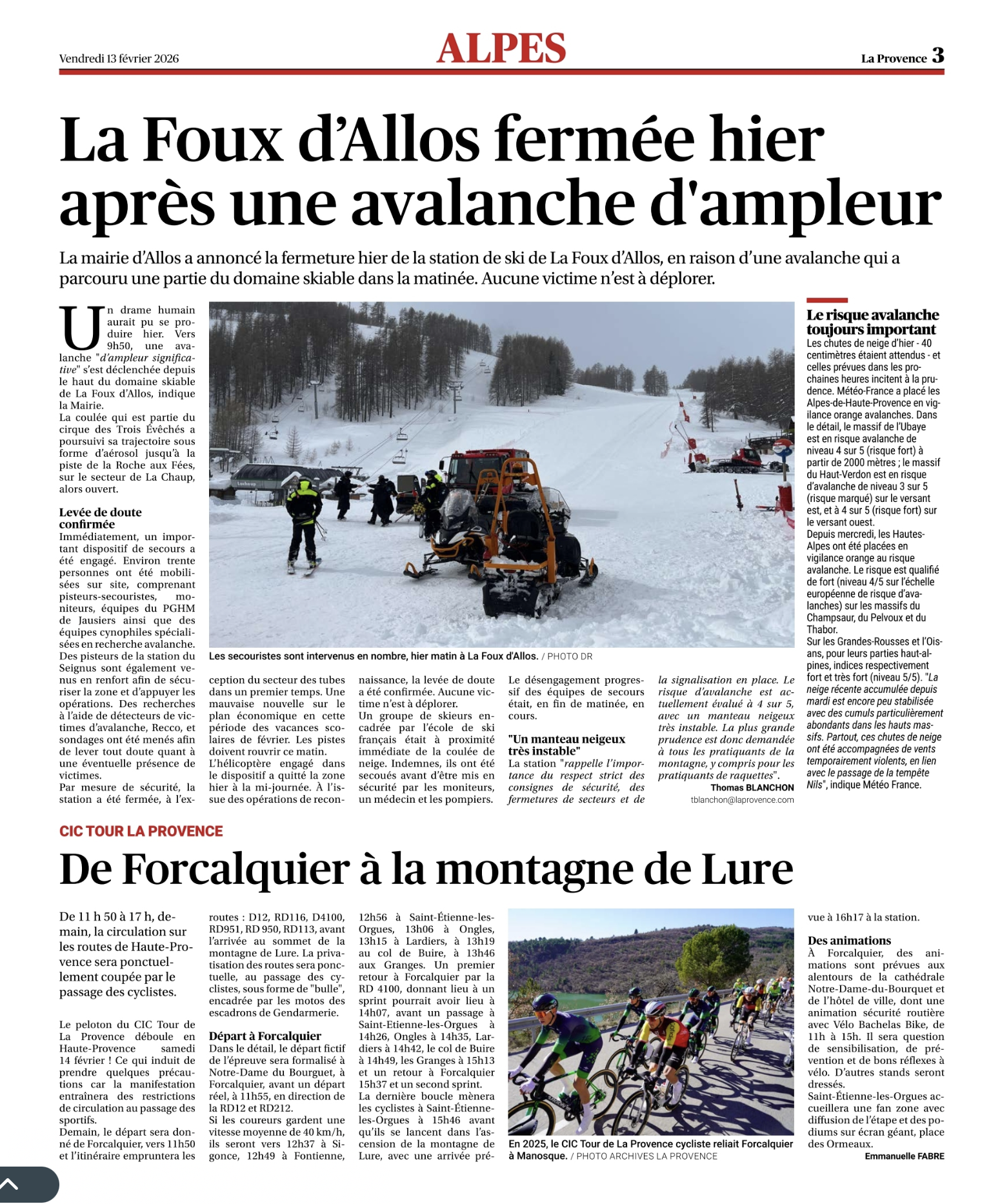 - Le papier de La Provence relate la fermeture complète d’une station après une avalanche d’ampleur mais sans victime, décision prise sur la base d’un risque encore élevé et d’une forte mobilisation de pisteurs, PGHM, services de recherche en avalanche, etc.