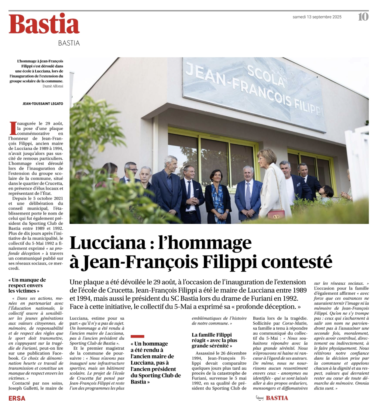 La polémique révèle à quel point la mémoire du drame de Furiani continue d’être vive et sensible dans la société corse. L’adoption du nom de Jean-François Filippi dans l’espace public reste une source de malaise, signe que les souvenirs restent douloureux pour de nombreux acteurs locaux, et que la réconciliation mémorielle autour de ce drame historique demeure inachevée.