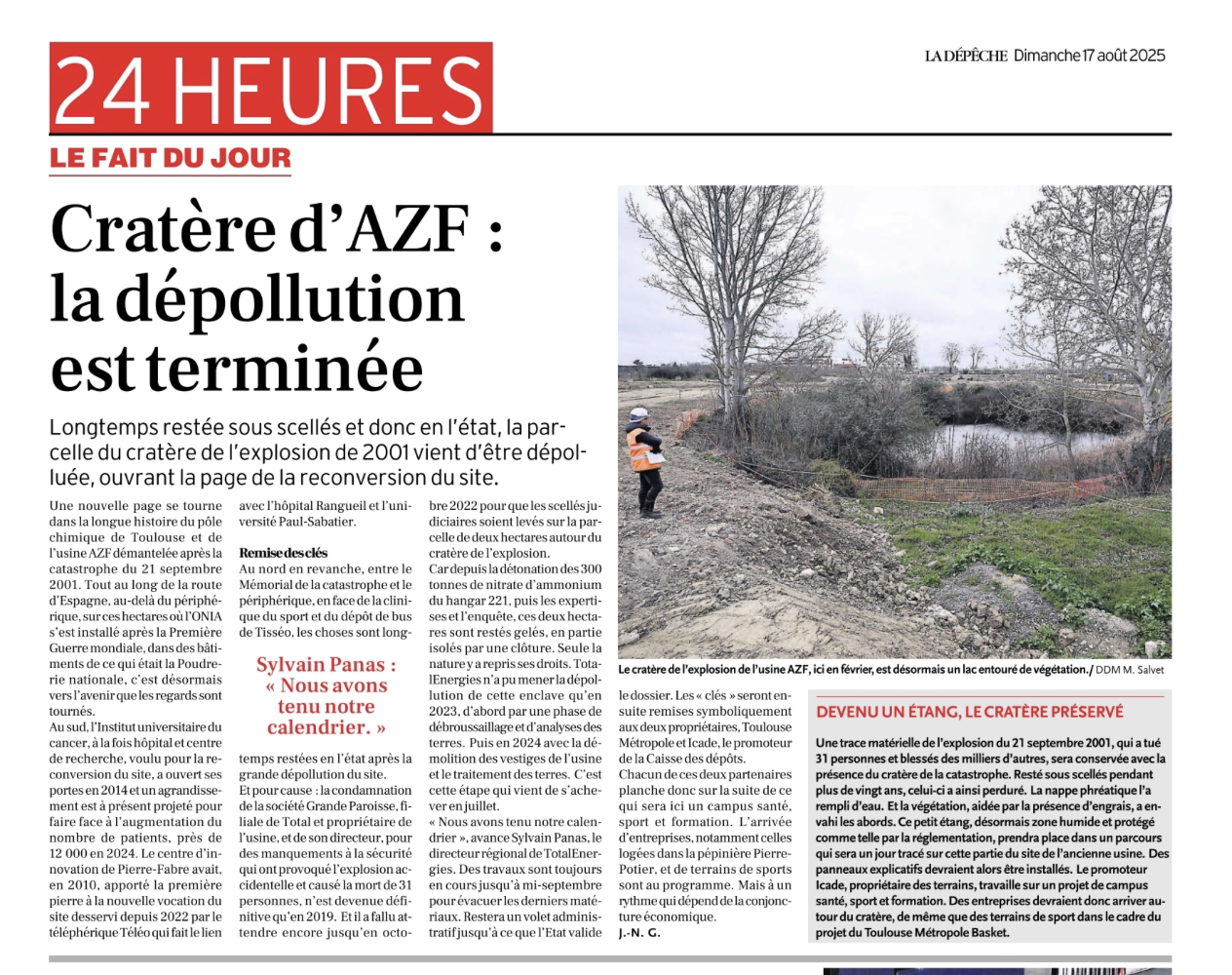 Près de 24 ans après le drame, la trace matérielle du cratère créée par l’explosion, où 31 personnes ont trouvé la mort et des milliers d’autres ont été blessées, demeure préservée comme un « cratère de catastrophe ». Ce lieu, longtemps resté à l’écart et protégé par des scellés, incarne la souffrance et le choc qu’a provoqués la tragédie auprès des habitants de Toulouse et au-delà.