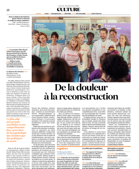 C’est aussi de la douleur que traite et appréhende le film « La Maison des femmes » qui relate le précieux travail du personnel de cette maison de Saint-Denis qui accueille les femmes victimes de violences, pour leur permettre de passer de la douleur à la reconstruction.