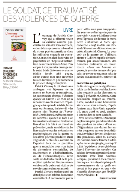C’est pourquoi l’ouvrage de Patrick Clairvoy, psychiatre au sein des forces armées intitulé « L’homme en guerre : psychologie du soldat » est un apport précieux à la compréhension du stress post-traumatique des militaires et au parcours de ceux-ci.